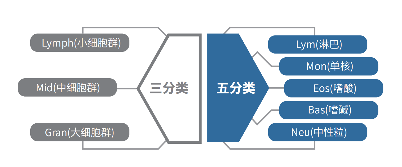 傳統的三分類血常規不能完全將自細胞分類,且自細胞計數受其他細胞影響;五分類血常規檢測對白細胞分類更詳細精準,細胞計數準確性大大提高。同時,通過五分類分析獲得的指標更全面,可以作為特定疾病的重要判斷標準。