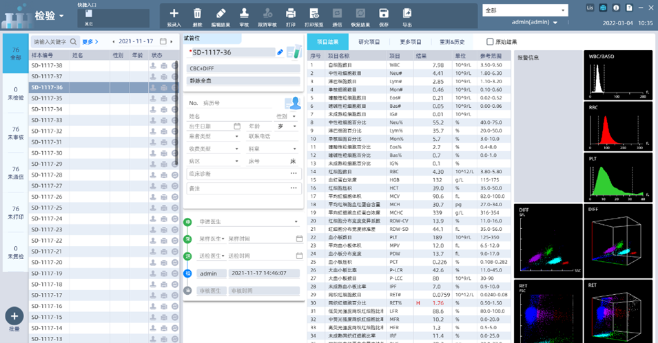 設備通過多角度半導體激光散射流式細胞分析法(WBC等)、電阻抗法(RBC/PLT)、無氰化物比色法(HGB)測得35項準確的血常規指標。